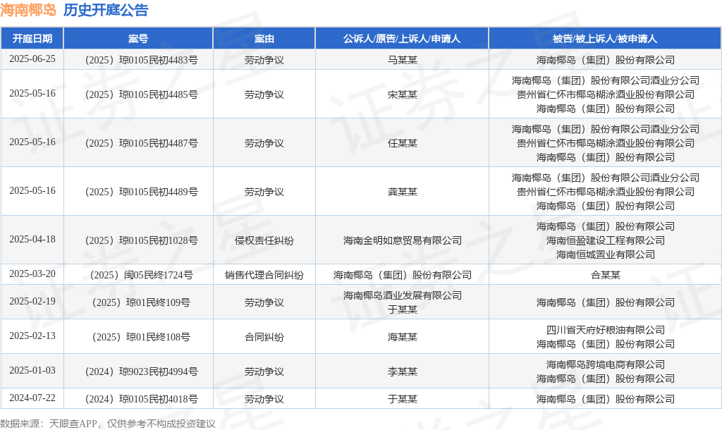 案号:(2025)琼0105民初4483号审理法院:海口市秀英区人民法院案由:劳动争议当事人信息: 原告/上诉人:马某某 被告/被上诉人:海南椰岛(集团)股份有限公司开庭日期:2025年6月25日根据统计,近一年内以海南椰岛(集团)股份有限公司为当事人的历史开庭公告有10则,其中案由为“劳动争议”的公告以7则居首,其次为“侵权责任纠纷”有1则,“合同纠纷”有1则。历史开庭公告如下: